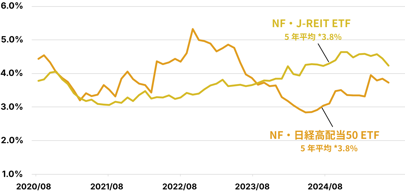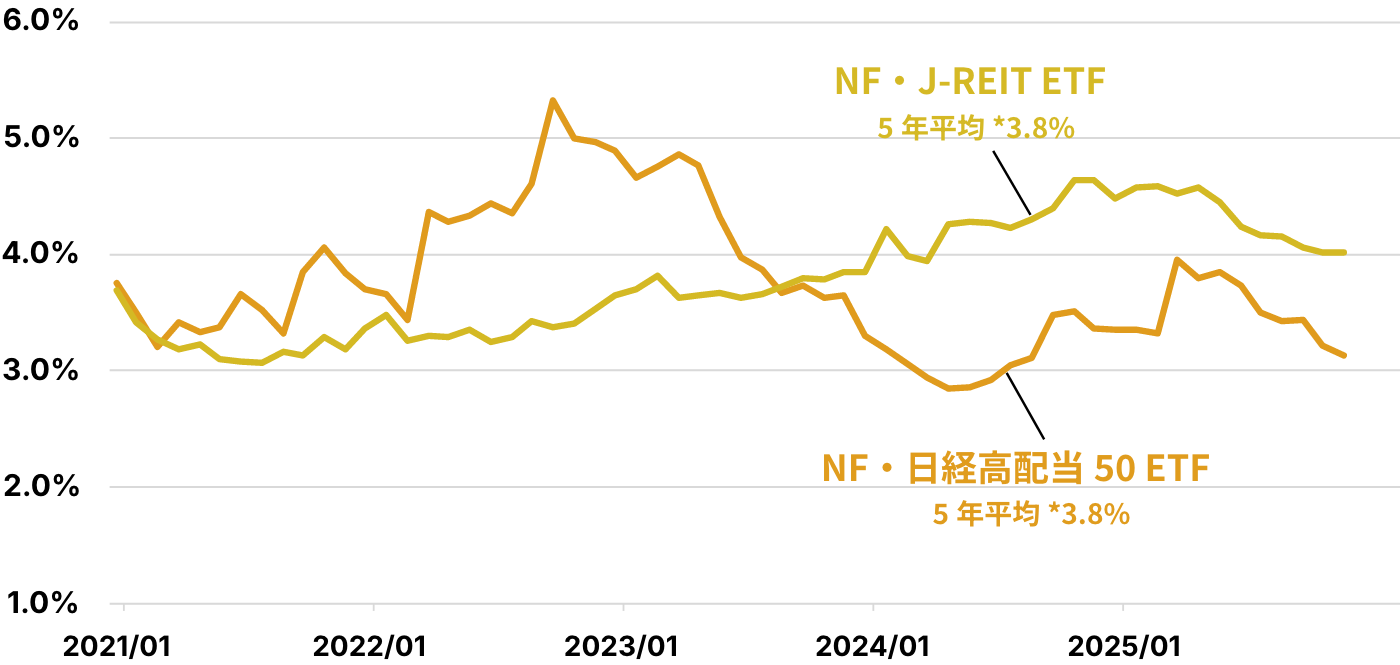 - * 過去1年、5年の平均分配金利回りは、各月末における分配金利回りを平均したものです。