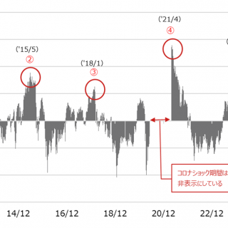 図表1で示した妥当レンジ上限を上回って上昇した6回の局面に〇を付けていますが、①②⑤の局面では概ね+20%前後の乖離率でピークアウトしている様子が分かります。また、④は+30%近くの乖離率となっていますが、コロナショックで利益が大きく落ち込み、妥当水準が切り下がった影響で乖離率が大きめに出ていると考えています。過去に照らし合わせれば、今回⑥の+20%超えという水準は循環的なピークになる可能性が高いと考えています。