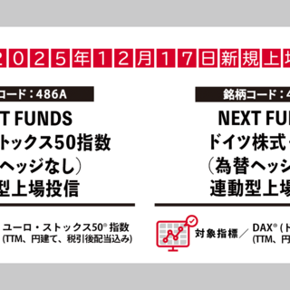 NEXT FUNDSより、新たに「ユーロ・ストックス50® 指数(TTM、円建て、税引後配当込み)」と「DAX®(ドイツ株価指数)(TTM、円建て、税引後配当込み)」を連動対象とする、為替ヘッジなしのETFが東京証券取引所に上場します。